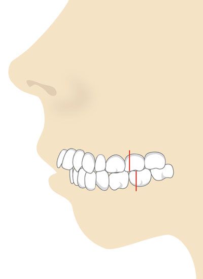 Die oberen Schneidezähne können dabei nach außen gekippt (Angle-Klasse II/1) oder nach innen verschoben (Angle-Klasse II/2) sein. Gelegentlich sind auch nur die mittleren Schneidezähne nach innen gekippt, während die äußeren nach außen weisen.